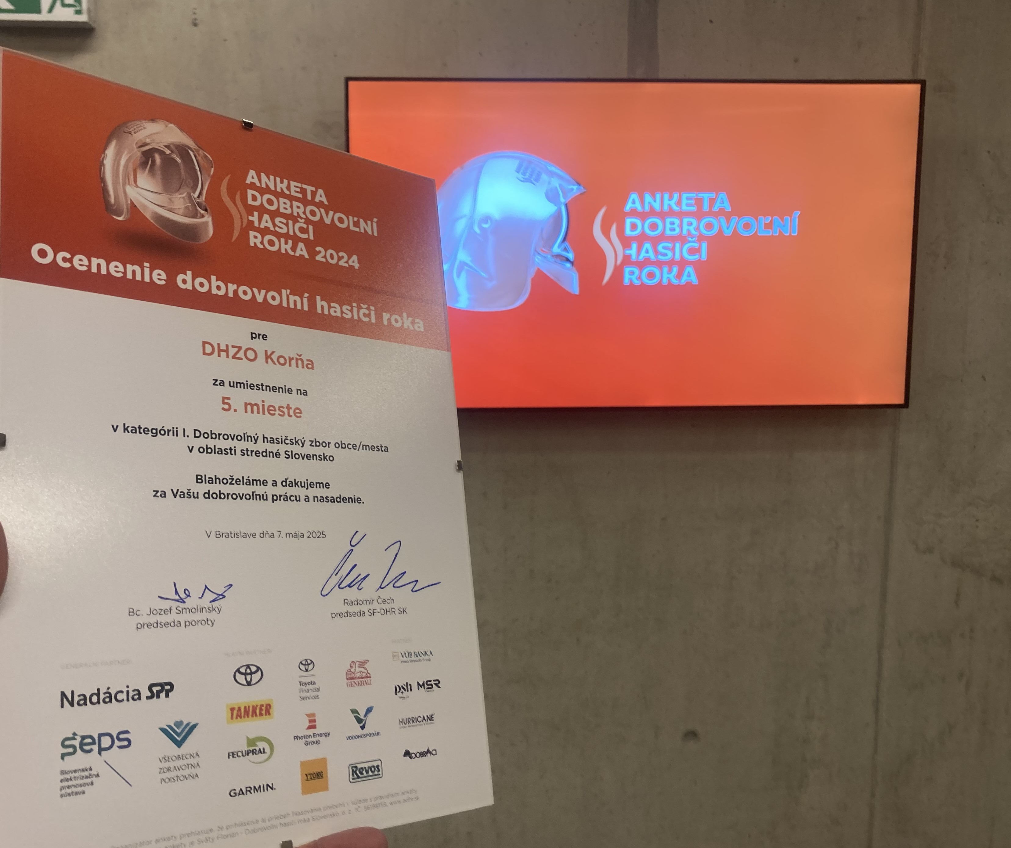 v lokalite stredného Slovenska a dostali sme sa do finále. Ďalšie hlasovanie na výber víťaza mala už v rukách verejnosť a hlasovala prostredníctvom formulára s emailom. Vo veľmi kvalitnej a tvrdej konkurencii sme obsadili 5.miesto a preto chceme úprimne poďakovať za všetky Vaše hlasy, podporu a slová gratulácie k tomu super výsledku. V prvom rade chcem obrovsky poďakovať našim členom, ktorí v roku 2024 vykonali 84 výjazdov – kde zdarma odslúžili 1 929 hodín zdarma + ďalej zdarma odpracovali 1 387 hodín na oprave techniky, údržbe hasičskej zbrojnice a hospodárskych prácach a aj našim zakladateľom, čestným členom a zosnulým členom, ktorí už na nás pozerajú z hasičského neba. Ďalej poďakovanie patrí vedeniu obce Korňa na čele so súčasnou pani starostkou Ing. Marianou Bebčákovou, obecnému zastupiteľstvu a jej predchodcom, vedeniu ministerstva vnútra SR, Hasičskému a záchrannému zboru SR, vedeniu Dobrovoľnej požiarnej ochrane, ministerstvu zdravotníctva SR, Dobrovoľnej požiarnej ochrane a zložkám Integrovaného záchranného systému, Polícii, HZS za podporu, spoluprácu a spoločnú činnosť pri záchrane osôb, majetku a ochrane životného prostredia. Ďakujeme našim sponzorom, podporovateľom, občanom a v neposlednom rade ďakujeme našim rodinám, manželkám, manželom, deťom, priateľkám, priateľom, rodičom za toleranciu našej absencie. Nakoľko naša časť života obetovaná v znení hesla „Bohu cťou – blížnemu pomocou – národu prácou“ je napĺňaná v každej našej činnosti.